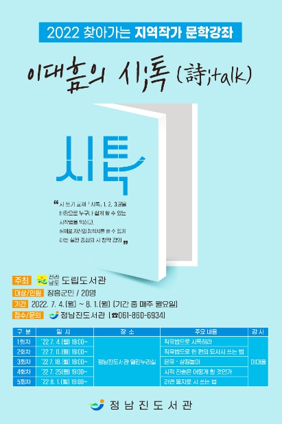 문학강좌는 7월 4일부터 8월 1일까지 매주 월요일 오후19시부터 정남진도서관에서 운영할 계획이며, 선착순으로 수강생 20명을 모집한다.