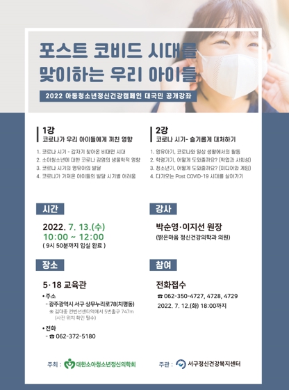 [남도저널 김용범 기자] 광주 서구가 코로나19가 아동·청소년에 끼친 다양한 영향 등을 다룬 공개강좌를 개최한다.