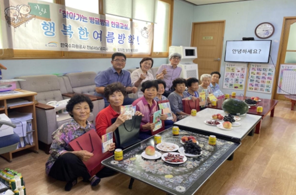 ‘찾아가는 방글방글 한글교실’은 한국수자원공사 전남서남권지사의 지원으로 유지되고 있으며, 정식 한글강사 자격증을 가진 백근화 선생님의 가르침 아래 한글 읽기, 쓰기와 손동작 활용을 위한 미술 수업 등 다양한 내용으로 7월12일까지 운영되었고 무더움 여름이 지나면 2학기 한글교실에서 다시 만날 것을 약속하였다.