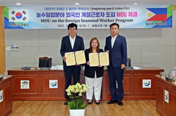 장흥군은 13일 군청 상황실에서 필리핀 루바오시와 외국인 계절근로자 도입을 위한 교류 협약을 체결했다.